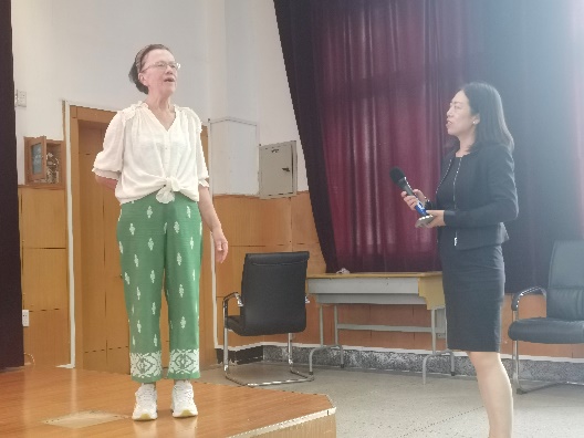 在互动问答的环节,同学们询问Hlide来中国的原因,Hlide外教则风趣地回答道小时候的她就拥有着中国孩子的长相。她认为,从那时候开始,她和中国便结下了不解之缘。在美国工作和生活一段时间之后,她下定决心是时候该来中国了,于是一张飞机票,她就来到了中国。当同学们问道,来中国面对的最大的困难是什么时,两位外教都提及到了语言问题。比如我们的外教Haruka在来中国之前,只会中国基本的问候语,如你好、谢谢等,现在的她,已经逐渐在中国生活的点点滴滴学习更多的中文。虽然外教Hlide对中文词汇和语法拥有一定的掌握力,但她也在实际的运用中,也会因为一些语音语调而闹出一