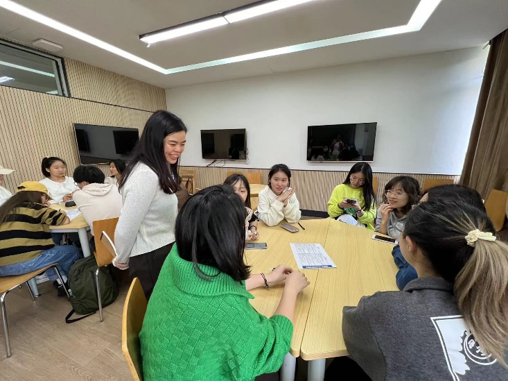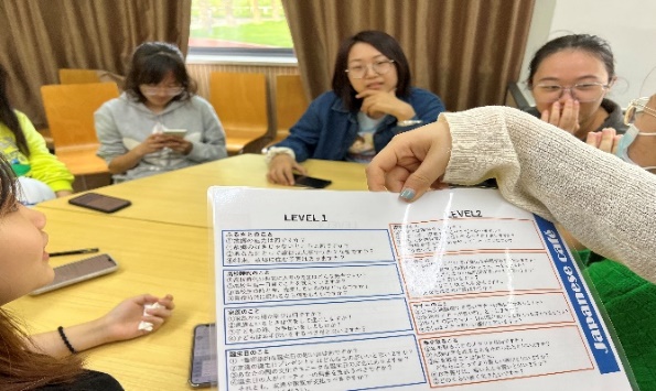 活动现场,同学们纷纷围桌而坐,用日语相互交流。Haruka外教主持活动的进行,认真倾听同学们日语发言的内容,并耐心纠正同学们的日语发音,引导同学们尽可能用日语表达出更加丰富的内容。