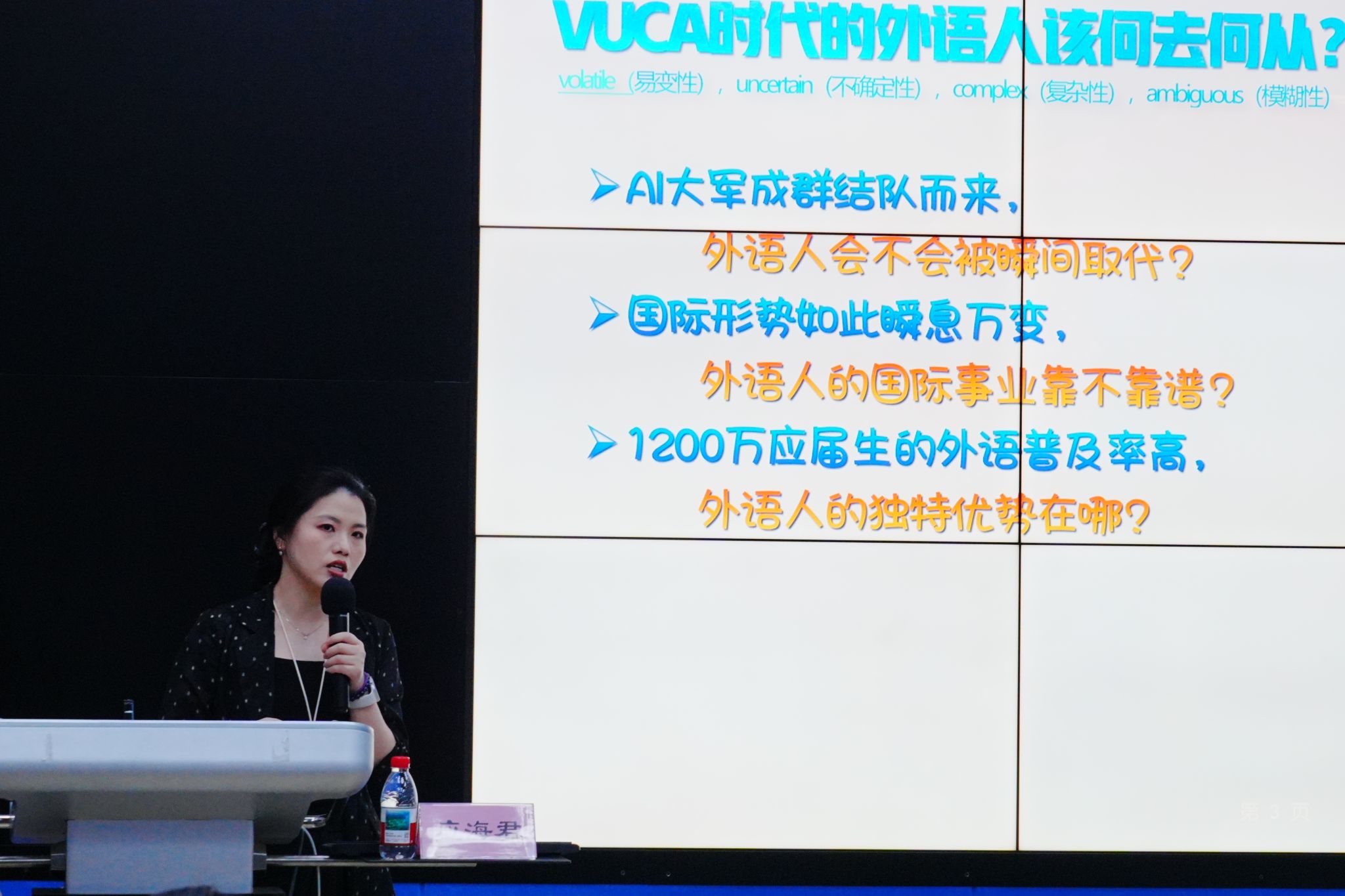 活动开场,主讲人应海君以一连串直击痛点的问题引发学生深思:“外语人会不会被瞬间取代”“外语人的国际事业靠不靠谱”“外语人的独特优势在哪”,引发在场同学热烈讨论。