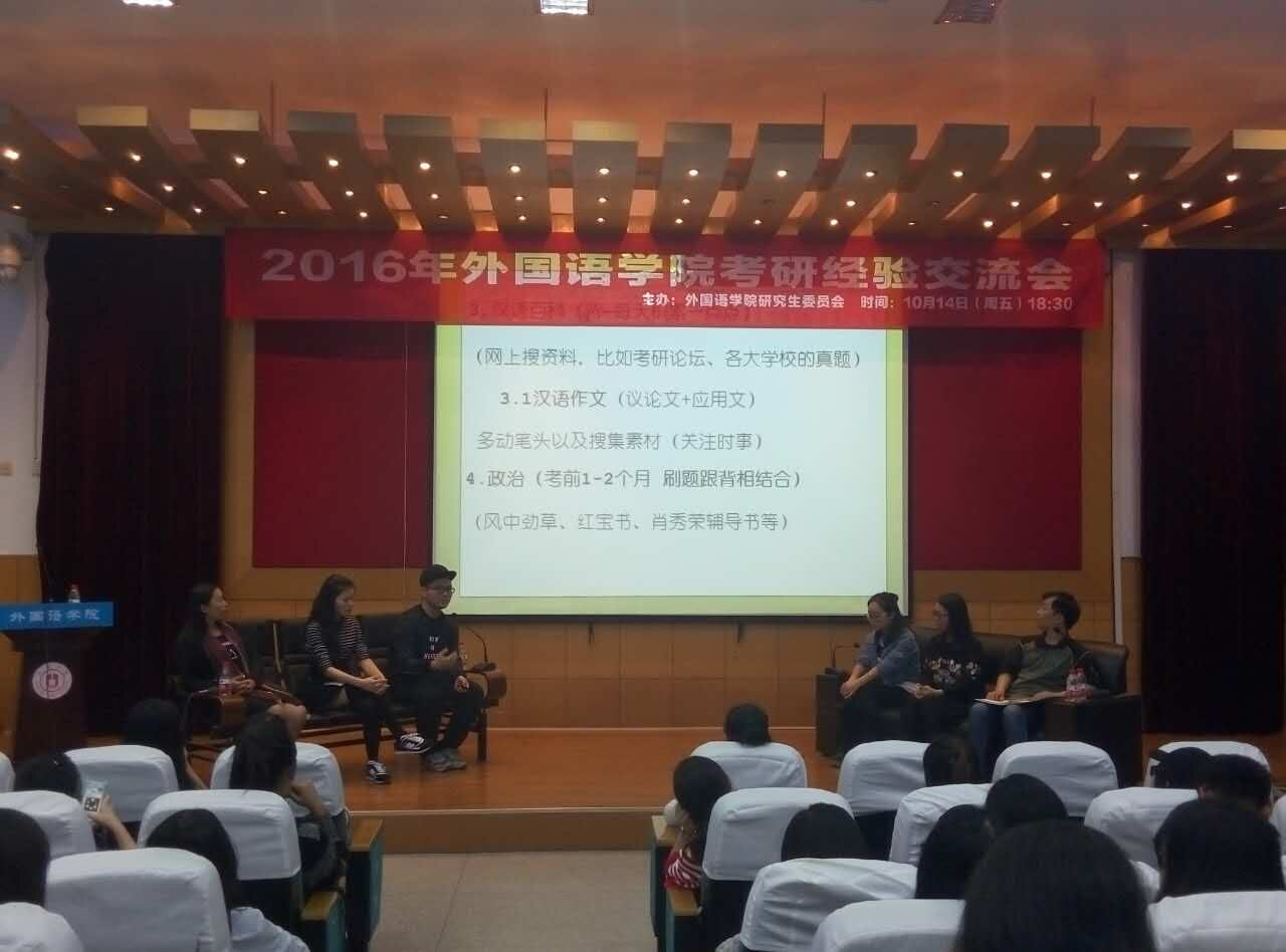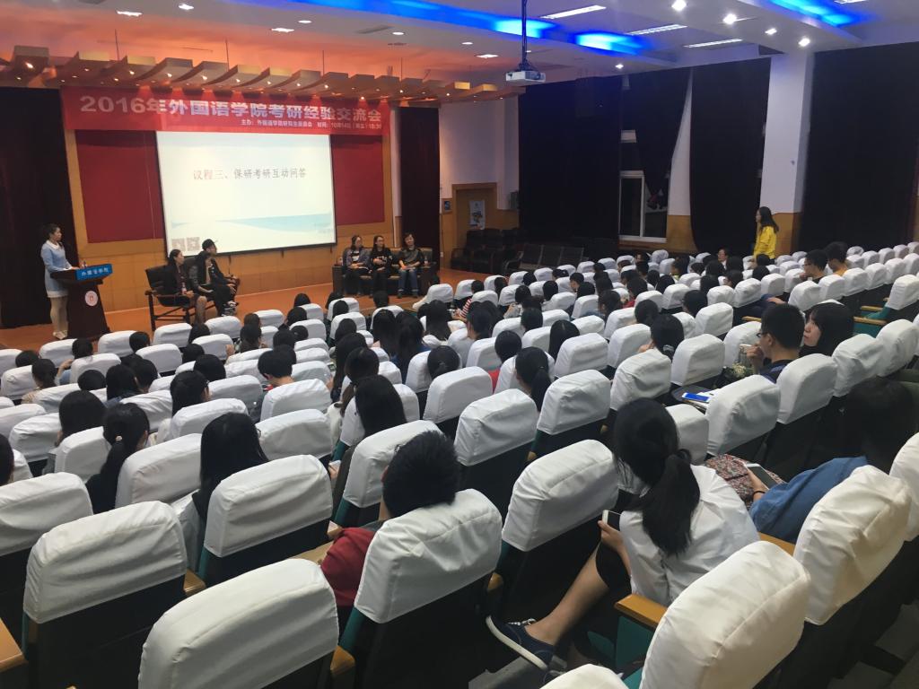 在外语楼218报告厅举办2016年“研续青春,共话未来”考研经验交流会。学院分管研究生工作副院长辛红娟、优秀研究生导师黄大网、2015年考入上海外国语大学笔译专业研究生马清清、2016年保研被上海外国语口译专业录取研究生张彩虹、2016年保研被华东师范大学学科教学专业研究生朱陈静和黄色视频