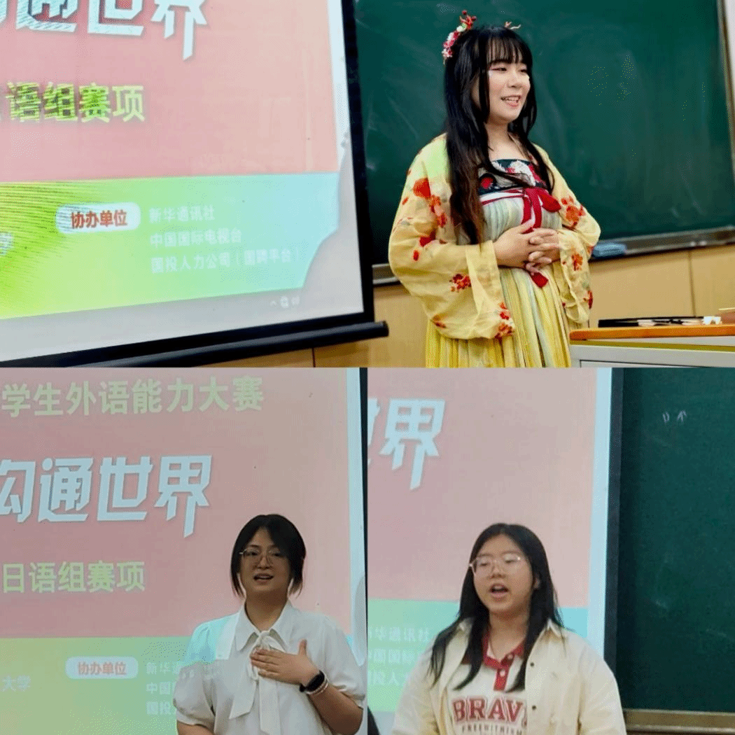 日语系两名选手摘获省赛金奖和银奖、国赛铜奖,成绩优异。本届报名选手覆盖了日语专业除大一外的本研学生。评委由日语专业学科带头人张楠教授、“国才杯”日语赛道指导团队日语系冯英华、李雪老师担任。