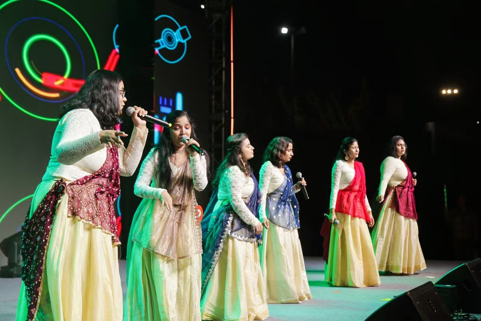 的中国选手韩慧用独特而富有磁性的嗓音演唱I Don't Think About You,歌曲的旋律在她的演绎下悠扬而略带忧伤,如同一条蜿蜒的河流,让听众一同感受一段情感的波折与起伏,最终流向了释怀与宁静的彼岸。一等奖获得者、来自医学部的印度姐妹花组合Hrythm设计了一组融合印度不同地区特色的旋律Indian Rhythm(mixed song)。观众在节奏的变化和律动中感受了印度部落传统音乐带来的奇妙感受,体会了印度多元化音乐的独特魅力。