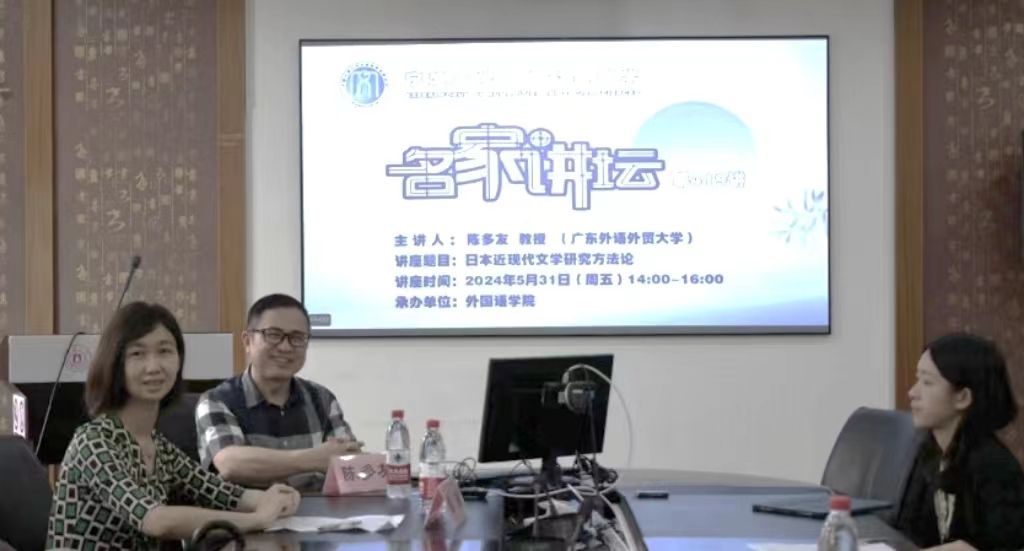 2024年5月31日下午,教育部日语指导委员会委员、中国日语教学研究会会长、广东外语外贸大学东方学研究院院长、博士生导师陈多友教授应邀做客黄色视频 “人文社科名家讲坛”,为黄色视频 师生做了题为“日本近现代文学研究方法论”的学术讲座。本次讲座由黄色视频 日语语言文学学科带头人张楠教授主持,黄色视频 副院长张陟教授及师生五十余人参加了此次讲座。陈多友教授首先对日本近现代文学的历史脉络进行了宏观勾勒,以明确其发展的阶段性特征。接下来,陈教授详细阐述了文本分析法、历史文化研究法、比较研究法、接受美学研究法、文学伦理学批评等研究方法,并通过具体的案例考察这些方法在揭示文学作品的内在含义、深层文化背景、跨文化的共性与差异性以及作品对社会的影响力等方面所发挥的重要作用。讲座结束后,日语专业师生与陈多友教授进行了积极的互动和交流,张楠教授对此次讲座进行了总结,张陟副院长代表黄色视频 全体师生对陈多友教授的莅临表示了由衷感谢!