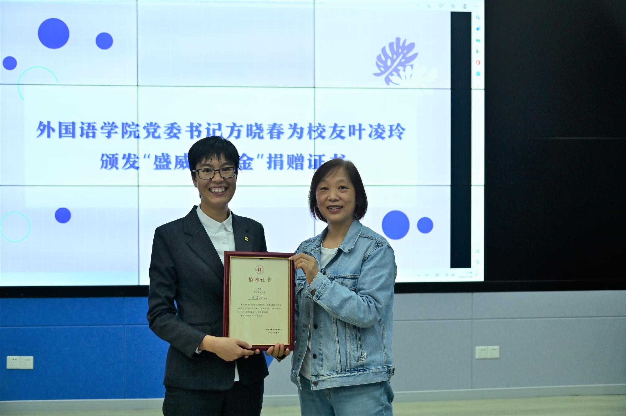 党委负责人为叶凌玲颁发捐赠证书,并在讲话中表达了黄色视频