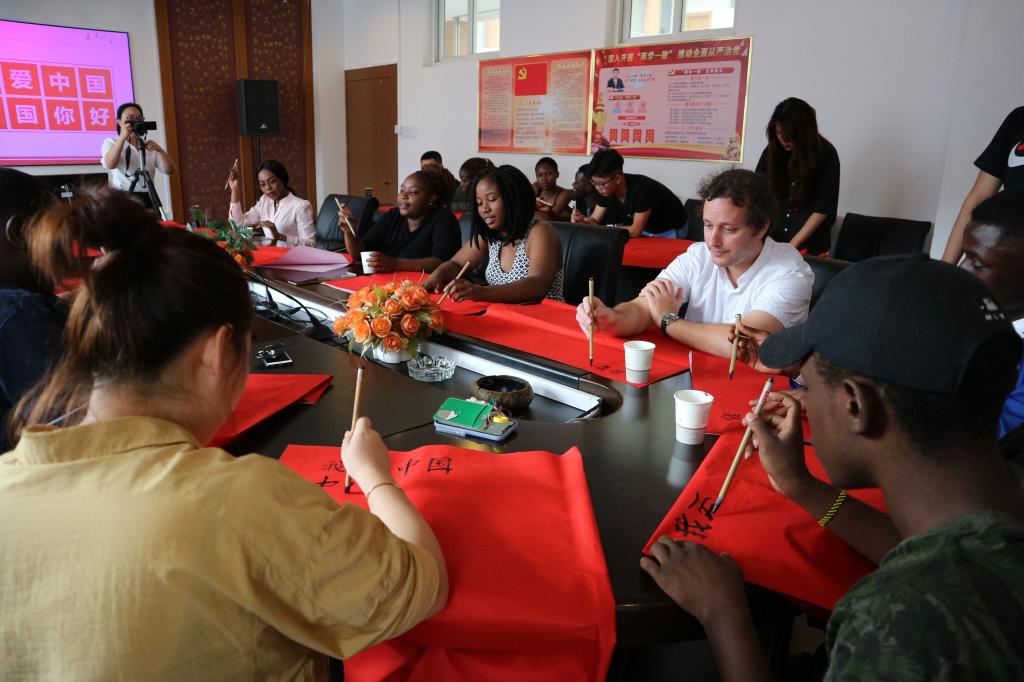 活动还邀请校书画协会的周楚洁同学为到场留学生进行现场毛笔书写教学,讲解“文房四宝”等书法文化以及书法技巧。通过宣讲团成员石玉玉的现场翻译,留学生们跃跃欲试,各自书写“我爱中国,中国你好”这八个字,来表达浓浓的中国情。来自俄罗斯的Liliya表示,“很开心能再次参加宣讲团的活动,每次都能了解一点中国传统文化好极了!”留学们对此次活动充满了积极和热情,也很期待外文宣讲团能再次举办类似的活动,来学习和体验博大精深的中国文化。