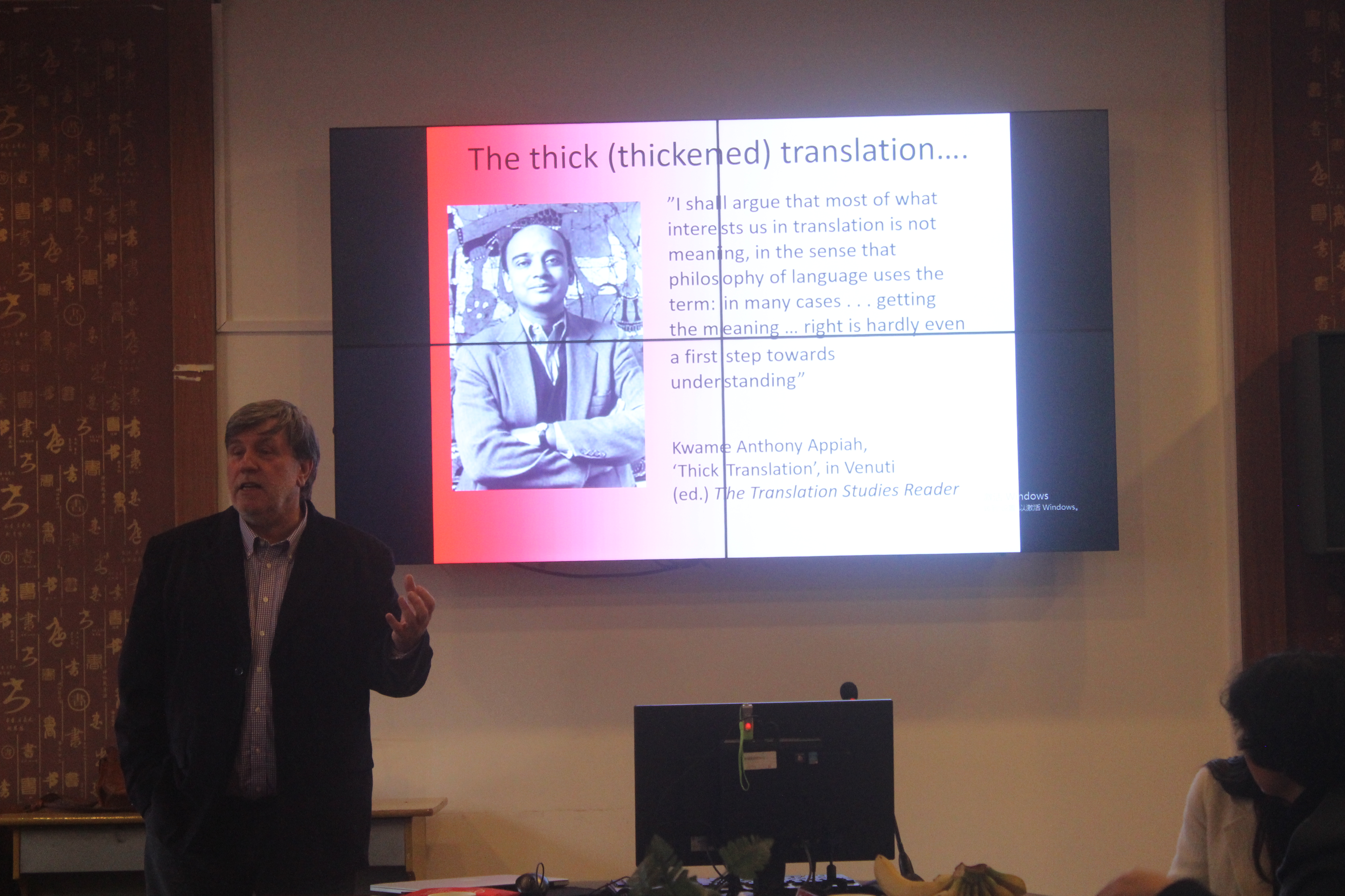 合作洽谈后,英国女王大学的Lily Guo对该校的基本情况、访学具体要求、生活及住宿等进行了方面进行了详细介绍。之后,David Johnston教授作了题为“翻译中的意义及其理解”(Translation: Meaning and Understanding)的精彩讲座。讲座后,针对讲座内容进行了有奖问答,整个会场气氛热烈,学生踊跃发言。