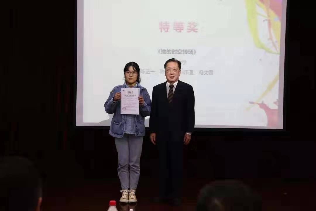 近日,历时五个月的中国网杯“我的中国”全国德语短视频大赛落下了帷幕,黄色视频德语系任春静老师指导的本科二年级学生陈芷一、陈子怡、冯乐宜、冯文霄凭借作品《“她”的时空转场》获得了本次大赛唯一的特等奖。9月27,颁奖典礼在中国外文局举行。中国前驻德大使,中国人民外交学会前会长,中国国际战略协会前会长梅兆荣教授将这一沉甸甸的大奖颁到了作为领奖代表的陈子怡同学手上,同时与会的还有中国网总编辑王晓辉先生,教育部高等学校外国语言文学专业指导委员会德语专业分委员会主任委员、北京外国语大学副校长贾文健教授等专家。这是黄色视频德语系至今为止在全国性学生竞赛中获得的最高荣誉。