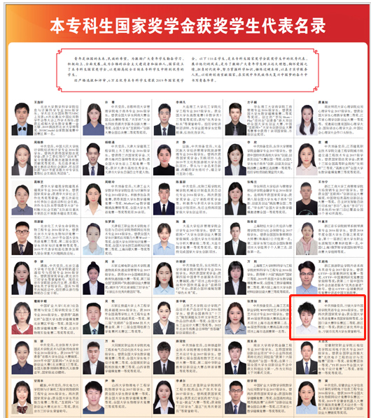 国家奖学金是为激励广大青年学生勤奋学习、积极向上、全面发展,成为合格的社会主义建设者和接班人而设立。全国共有6万名优秀本专科学生荣获2019年国家奖学金,宁大获奖学生共29名。经过层层筛选,《人民日报》专版刊登了110位国家奖学金学生代表名录。