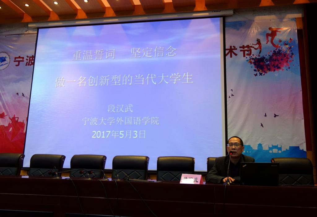 党委书记段汉武进行了题为“重温入党誓词,坚定理想信念”的专题讲座。段汉武指出,作为当代大学生,要有坚定的信念,同时付诸行动,努力学好专业基础知识课程、专业技能课程、专业方向课程以及社会实践课程,提高人文素养及个人综合能力,并在此基础上勇于创新,努力发展成为外语类创新型人才。作为最富有朝气、最富有创新、最富有生命力的群体,当代大学生应肩负起为祖国和人民建功立业的重任,创造无悔青春。学院各教工支部书记以及本期党校学员共同聆听了本次讲座。