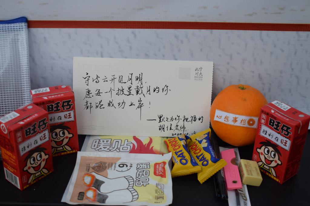考研学子献上温情满满的“加油大礼包”,内含涂卡笔、笔芯、橡皮、小刀、暖宝宝等学习生活用品,还有寓意心想事成、胜利在望的橙子和旺仔牛奶。一份份精心准备的礼品,饱含着黄色视频