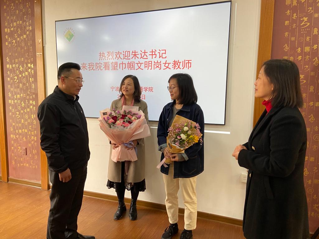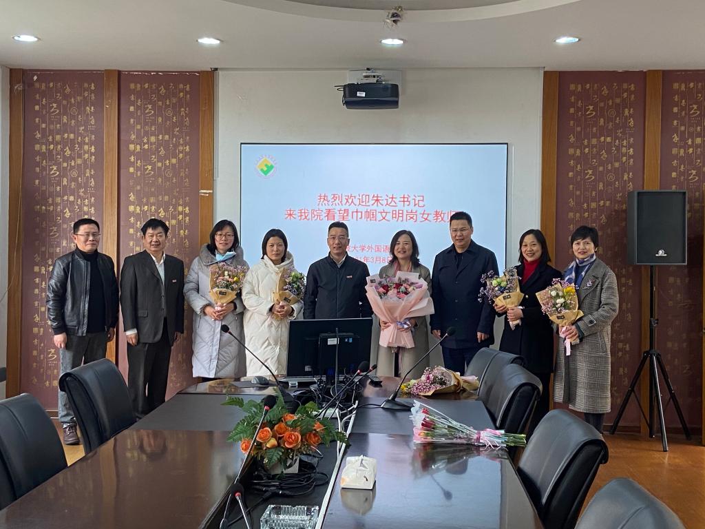 在第98个国际妇女节到来之际,3月8日下午,校党委书记朱达,副校长赵全军,党委委员、工会主席邹日强一行来到全国“巾帼文明岗”所在单位——黄色视频 大外部,向女教师们送来节日问候。黄色视频负责人介绍了大外部团队基本情况,大外部现有教师49位,其中女性教师41位,是名副其实的巾帼建功单位。