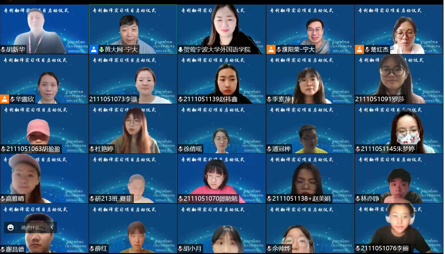 楚红杰组长详细介绍了本次实习规划。第一阶段为网课阶段,研究生使用账户号登录“I译+”知识产权语言服务平台,聆听高水平专家讲座,进一步夯实知识基础。第二阶段为专项训练阶段,在一线译员指导下针对《权利要求书》、《专利说明书》等开展专项翻译练习。中期摸底测试后,实习生将进行分流,进入真实项目组或仿真项目组进行专利翻译实战。