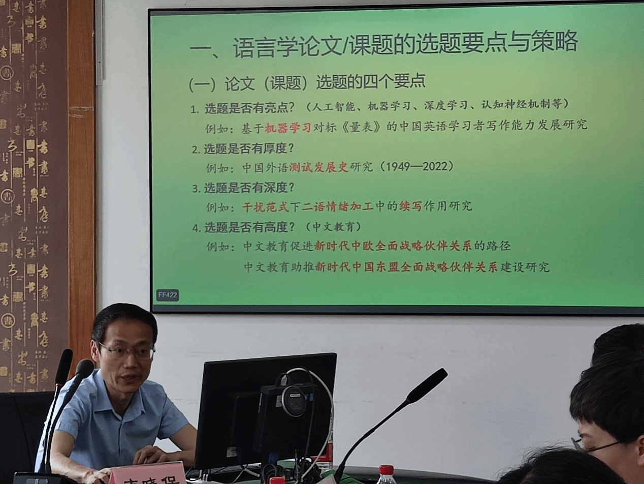 副院长、外国语言研究所所长、认知神经语言学实验室主任韦晓保教授在422会议室以“语言学论文(课题)之选题策略、设计与方法”为题,为黄色视频师生带来了一场精彩的学术讲座,讲座由丛迎旭副教授主持。