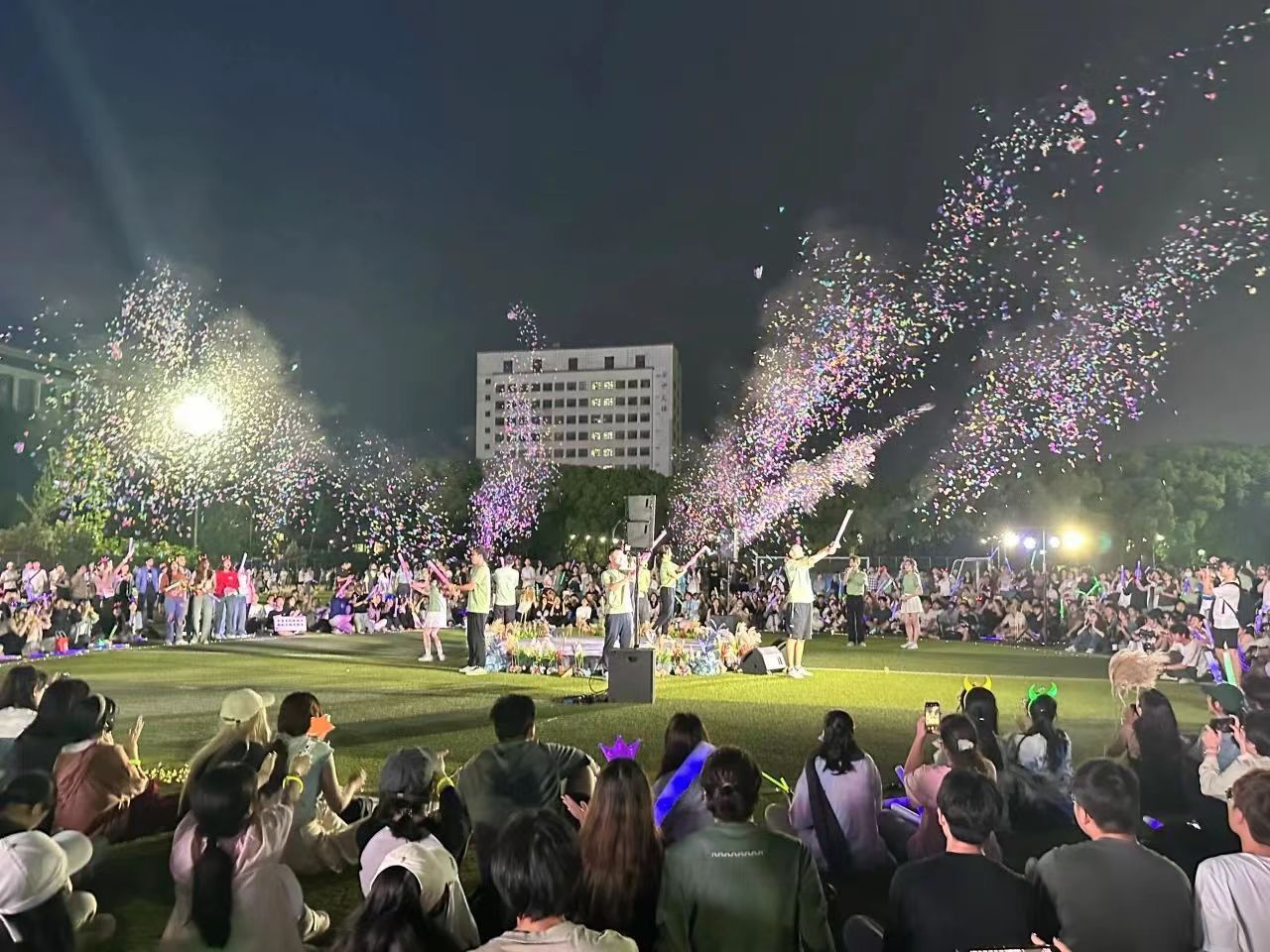 在一首首由同学们票选产生的预热歌曲烘托下,上千名师生早早地围绕中心舞台席地而坐。伴随着雷鸣般的掌声,首届外文音乐交流大赛冠军朱怡然的一首Love Story将现场氛围点燃;中外大学生共同编排的舞蹈Blank Space & Shake it off、Cruel summer 把热烈的氛围推至高潮;多位“霉粉”自发组织演唱的歌曲Style 更是让现场观众纷纷齐声合唱,赢得欢呼一片。活动现场宛若一场激情四溢的霉霉专场草坪音乐会,跳动的音符与跃动的青春在田径场上空激荡。