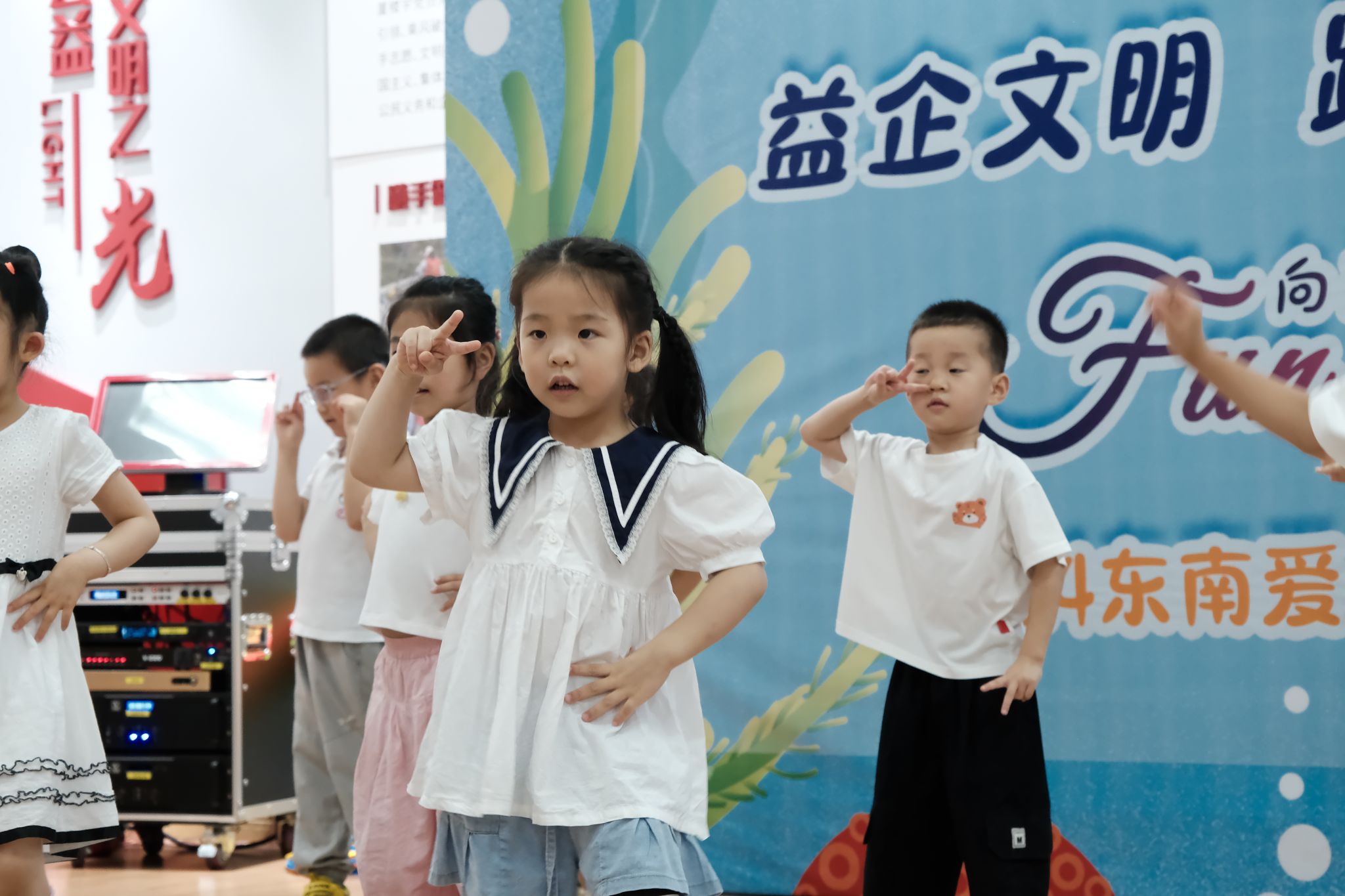 “甬港知行、向young而生”校企共育实践团队全体成员与42位暑托班小朋友一起参加了欢乐而温情的结业仪式。实践团负责人、22英语师范班班长陈韫伊与东南爱心暑托班小朋友代表王诗宸一起主持了活动。