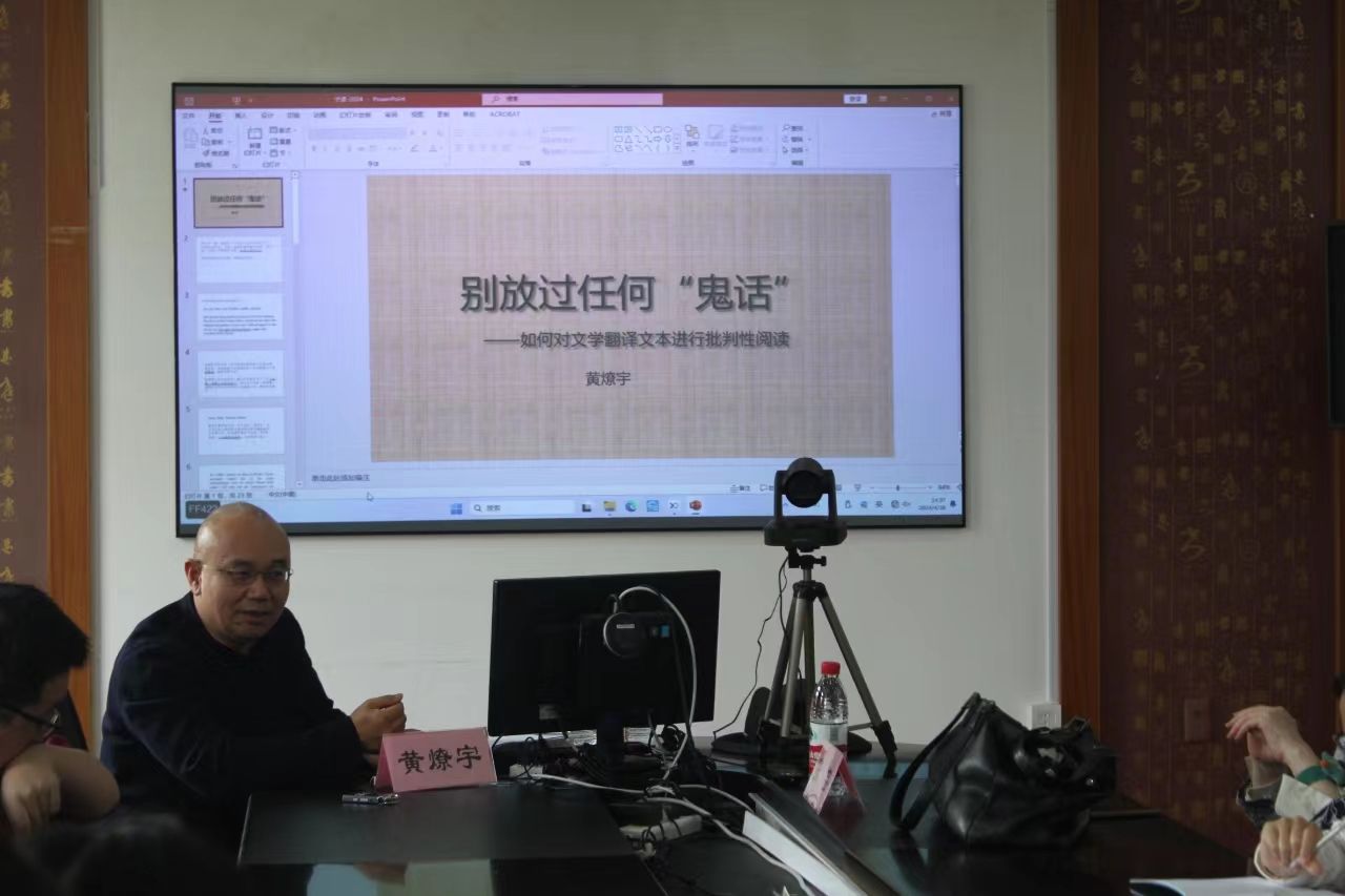 讲座伊始, 黄燎宇教授对“鬼话”一词作了定义:一切违背常识、逻辑和科学的话。他认为,“鬼话”在各种语言的文学文本中都有存在,并以《战争与和平》中译本进行举例说明。讲座主题由此拉开帷幕,黄教授摘选出《魔山》等德语文学的中译本,尤其是名家译本中存在的“鬼话”,带领大家厘清这些“鬼话”背后真正的涵义。例如:“劳夫人是位女士”,这句话的德文是“Frau Rau ist eine Dame”。这里,译者将“Dame”翻译成“女士”显然是不符合常理的,黄教授带着疑问阅读了上下文后,找到了问题所在:这位劳夫人经营着一家杂货铺,尽管铺子里堆满了各式各样的东西,但劳夫人看上去很得体。所以这里的“Dame”译为“淑女”更合适。通过对类似例子的讲解,让大家感受到文学翻译中的严谨与细致。