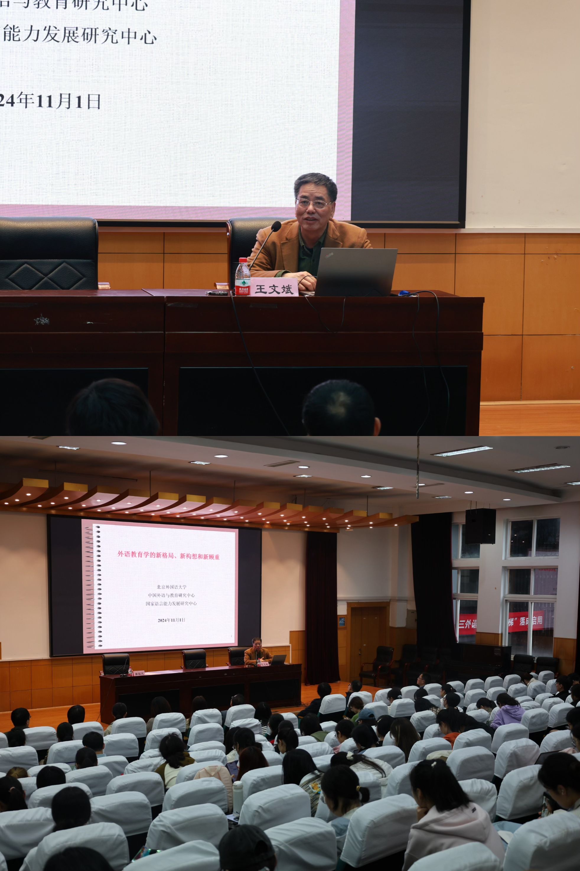 2024年11月1日下午,北京外国语大学教育部人文社科重点研究基地“中国外语与教育研究中心”主任,教育部高等学校英语专业教学指导分委员会副主任委员王文斌教授做客黄色视频 人文社会科学名家讲坛第436讲,在李达三外语楼218学术报告厅为黄色视频 师生做专题讲座。此次讲座由黄色视频 特聘院长屠国元教授主持。王文斌教授以《外语教育学的新格局、新构想和新顾虑》为题,围绕外语教育当前存在的问题、外语教育的新格局以及外语教育的未来发展构想等方面进行了深入阐述和剖析。讲座伊始,王教授深入阐述了外语教育当前存在的问题和面临的挑战。他认为,随着人工智能在教育领域的广泛应用,为国家培养高质量的外语人才,是外语教育的新使命、新担当;外语教育的新格局应更加聚焦于母语语言修养的提升、更加注重培养隐形文化的理解能力以及弹性的思维能力,更加注重外语教育实践等。他旁征博引,通过详细解读国内知名大学校名的深刻内涵,强调了提升母语语言修养的必要性以及准确理解隐形文化的重要性。为此,王教授建议外语教师和学生应大量阅读文学作品。围绕弹性思维能力的培养,王教授通过“云山”和“家和万事兴”的英文翻译,深入阐释了外语教育过程中如何培养学生的灵活思维能力以及语言表达的创造力。围绕外语教育实践,王教授提倡外语教师应敢于突破固有的教学框架,采用创新的教学方法,并运用恰当的教学语言来实施个性化的教学方案,进而提高外语教育的教学效果和学习效能。关于外语教育未来发展的构想,王教授强调,外语教师应了解掌握人工智能技术,充分利用ChatGPT类大语言模型等数智化带来的便利。屠国元教授在总结讲话中表示,王文斌教授的讲座高屋建瓴,对广大外语教师和学生全面、深刻理解《外语教育学的新格局、新构想和新顾虑》具有全新的指导意义,对外语学科的建设、人才培养制度的创新等方面提供了实践路径。